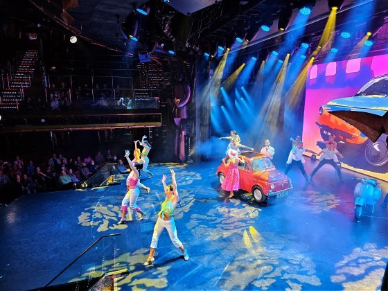 대극장의 뮤지컬 공연.저녁을 먹고 많은 사람들이 가장 많이 찾는 곳은 대극장이다. 3,4,5층까지 이어지는 대극장에서는 매일 밤 오후 8시반부터 1시간 가량 메인 공연이 펼쳐진다. 러시아와 동유럽 출신 남녀 무용수들이 펼치는 아크로바틱 댄스, 서커스와 마술, 뮤지컬과 콘서트 공연에 사람들은 아낌없이 박수를 보낸다. 마지막 날에는 이탈리아인 선장과 스태프들이 샴페인잔을 들고 승객들에게 환송 인사를 하고, 사진을 찍는 파티를 연다.