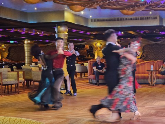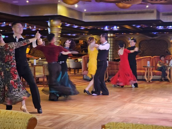 대극장 공연이 끝나면 크루즈선 곳곳에서 파티가 본격적으로 이어진다. 그 중에서 가장 눈길을 끈 것은 전국에서 온 라틴 댄스동호회 회원들이었다. 우아한 드레스를 입은 회원들은 메인 홀 에서 자리를 잡았고, 필리핀, 말레이시아 출신 악단이 현장에서 직접 연주하는 음악에 맞춰 왈츠부터 바차타, 탱고까지 날아갈 듯 가볍게 댄스를 선보였다.