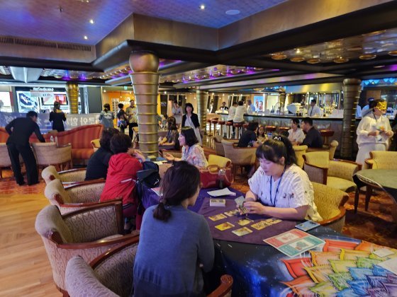 승객들에게 타로 점을 봐주며 상담해주는 타로 동호회원들.친구끼리 크루즈 여행을 왔다면? 갑판부터 수영장 주변, 홀 곳곳에 있는 바를 돌며 한 잔씩 하는 경험도 나쁘지 않다. 한 잔 한 잔 주문할 경우 맥주와 와인, 위스키 한잔이 5달러 정도하지만, 35달러 정도를 내면 3박4일간 음료를 무제한 이용할 수 있다. 크루즈 여행은 중장년층의 전유물이라고 생각했는데, 예상 외로 젊은 승객들도 디스코텍이나 바에서 밤늦게까지 모임을 가지며 즐기는 사람들이 많았다.