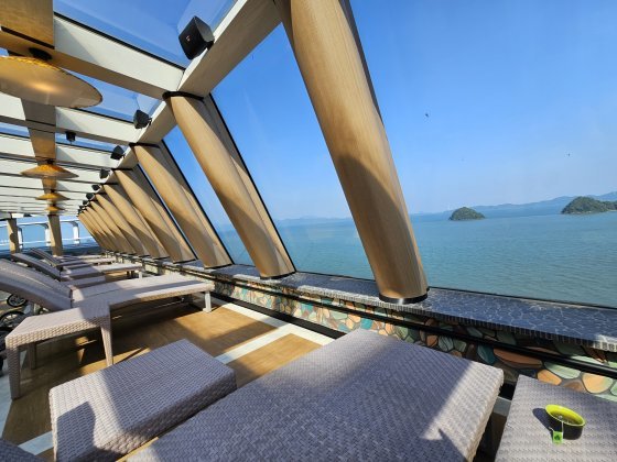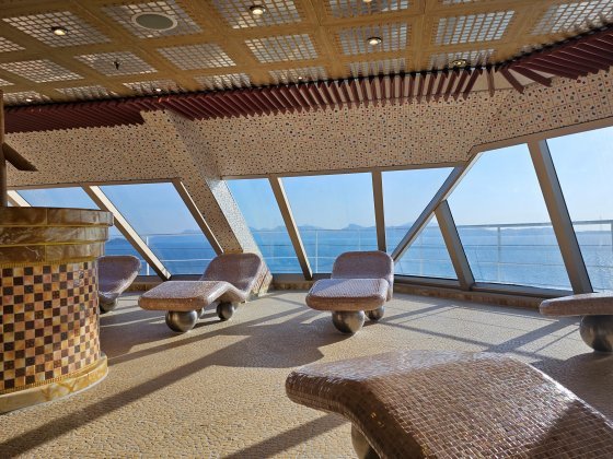 바다 전망 사우나.크루즈 선내에서 개인적으로 가장 만족스러운 공간이 있었다면? 그것은 바로 사우나다. 한국, 일본, 중국, 대만, 싱가폴, 태국 등 아시아 시장에서 크루즈 여행을 확대해온 코스타세레나호는 9층과 10층에 대형 스파시설을 갖추고 있다.