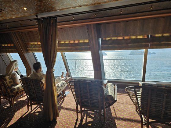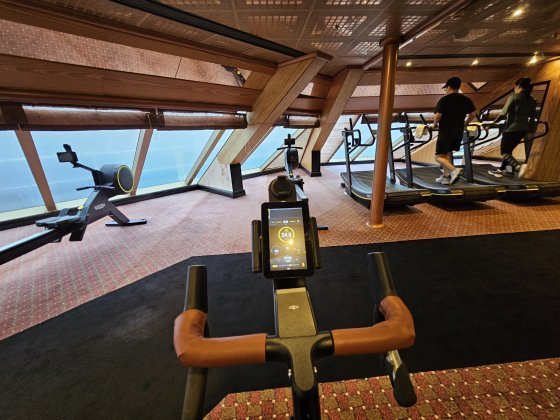 먼저 아침에 일어나면 바로 사우나로 달려간다. 바다를 바라보며 피트니스센터에서 러닝머신으로 간단하게 몸을 푼다. 물론 본격적인 운동을 하고자 함은 아니다. 바다를 바라보며 런닝머신을 뛰고 있다는 사실 만으로도 기분이 좋아지기 때문이다. 기항지 여행을 마치고 저녁에 돌아온 후에도 바로 사우나로 향한다.