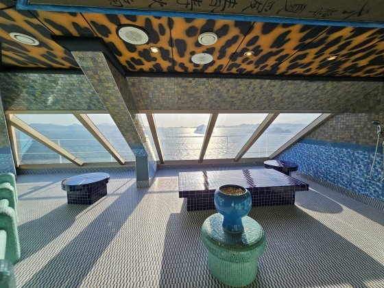 바다 전망 피트니스센터.바다를 바라보며 실내자전거와 러닝머신을 탈 수 있는 피트니스 센터 옆에는 대형 자쿠지 풀이 있고, 일본식, 중국식 건식사우나 시설과 핀란드식 습식사우나 시설을 갖추고 있다. 타일이 붙어 있는 따뜻한 돌로 된 릴렉스 의자에 누워서 가운을 입고 사우나를 할 수 있는 데, 유리창을 통해 바다에 떠 있는 섬들 사이로 햇살이 부서진다.