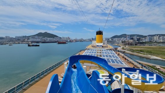 크루즈선의 갑판에 있는 야외 수영장과 워터슬라이드 시설. 시원한 바다 풍경을 즐기며 수영장 물에 풍덩 빠지는 이색적인 경험을 할 수 있다.크루즈 여행은 부모님 환갑이나 칠순을 맞아 형제 자매 가족끼리 온 사람들도 있고, 동창회와 향우회, 동호회원들끼리 온 단체 여행객들이 많았다. 세 형제가 부양 가족들과 함께 여행을 온 김현수 씨(52)는 “가족끼리 여행을 해봤어도 이렇게 많은 대화를 한 것은 처음”이라며 “한배를 타고 여유롭게 함께할 수 있다는 것이 크루즈 여행의 묘미”라고 말했다.