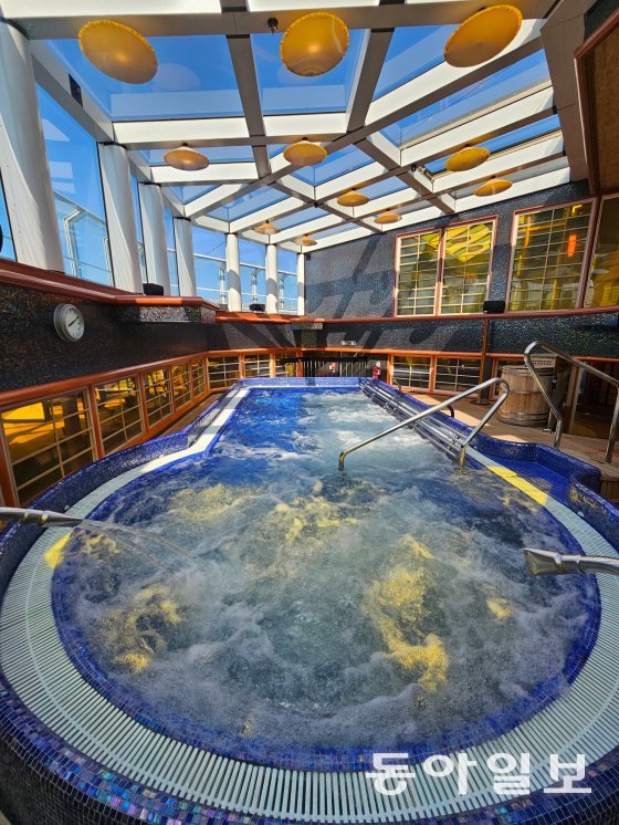 유리창을 통해 하늘이 보이는 사우나 풀.● 크루즈 승객들에 대한 열렬한 환영