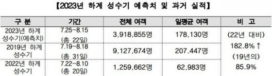 2023년 하계 성수기 예측치 및 과거 실적(인천공항공사 제공) / 뉴스1올해 성수기 동안 이용객이 가장 많은 날은 8월 6일이며, 약 19만 1199명의 여객이 인천공항을 이용할 것으로 예측된다.