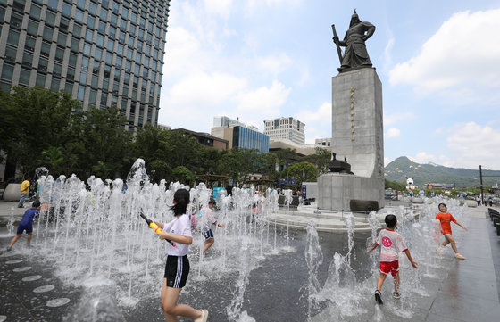 전국적으로 폭염특보가 내려진 지난 4일 서울 광화문광장 바닥분수에서 어린이들이 물놀이를 하며 더위를 식히고 있다. / 뉴스1서울시는 ‘2023 새만금 세계스카우트 잼버리’에 참여한 대원들에게 서울에서의 체험 프로그램을 제공한다고 6일 밝혔다.