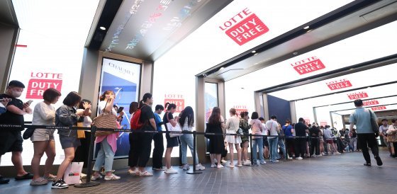 14일 오전 서울 중구 소공동 롯데면세점에서 외국인 관광객들이 입장을 기다리고 있다. 중국 정부가 2017년 이후 6년 만에 한국