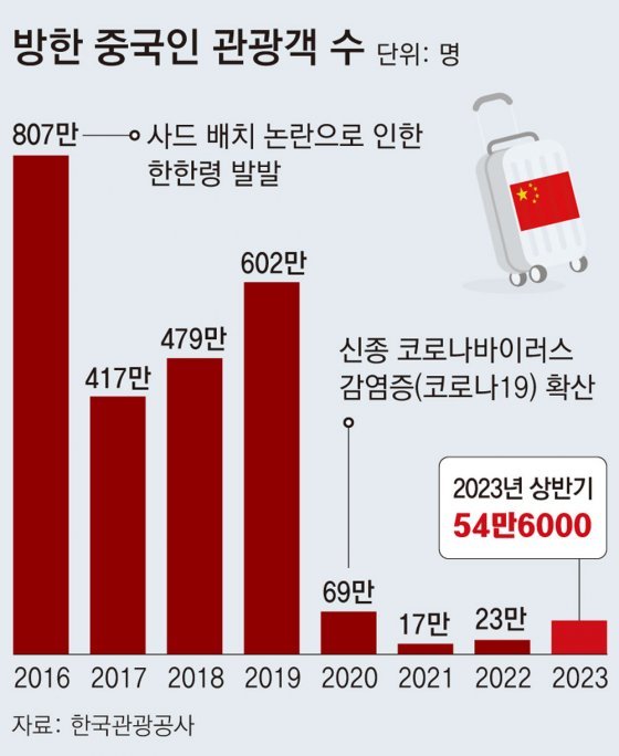 중국을 오갈 항공편 확보도 난항이다. 국적 항공사인 대한항공과 아시아나항공 모두 한국행 단체 관광 재개에도 즉각적인 증편 계획을 밝히지 않고 있다. 그나마 저비용항공사(LCC) 등이 노선 확대에 나서고 있지만 한때 중국 관광객이 연간 약 800만 명에 이르렀던 점을 고려하면 좌석 공급이 턱없이 부족하다는 지적이 나온다. 항공업계 관계자는 “중국 노선을 늘리는 건 모험에 가깝다”며 “중국 관광객 수가 가시적으로 확인돼야 증편이 이루어질 것”이라고 말했다.