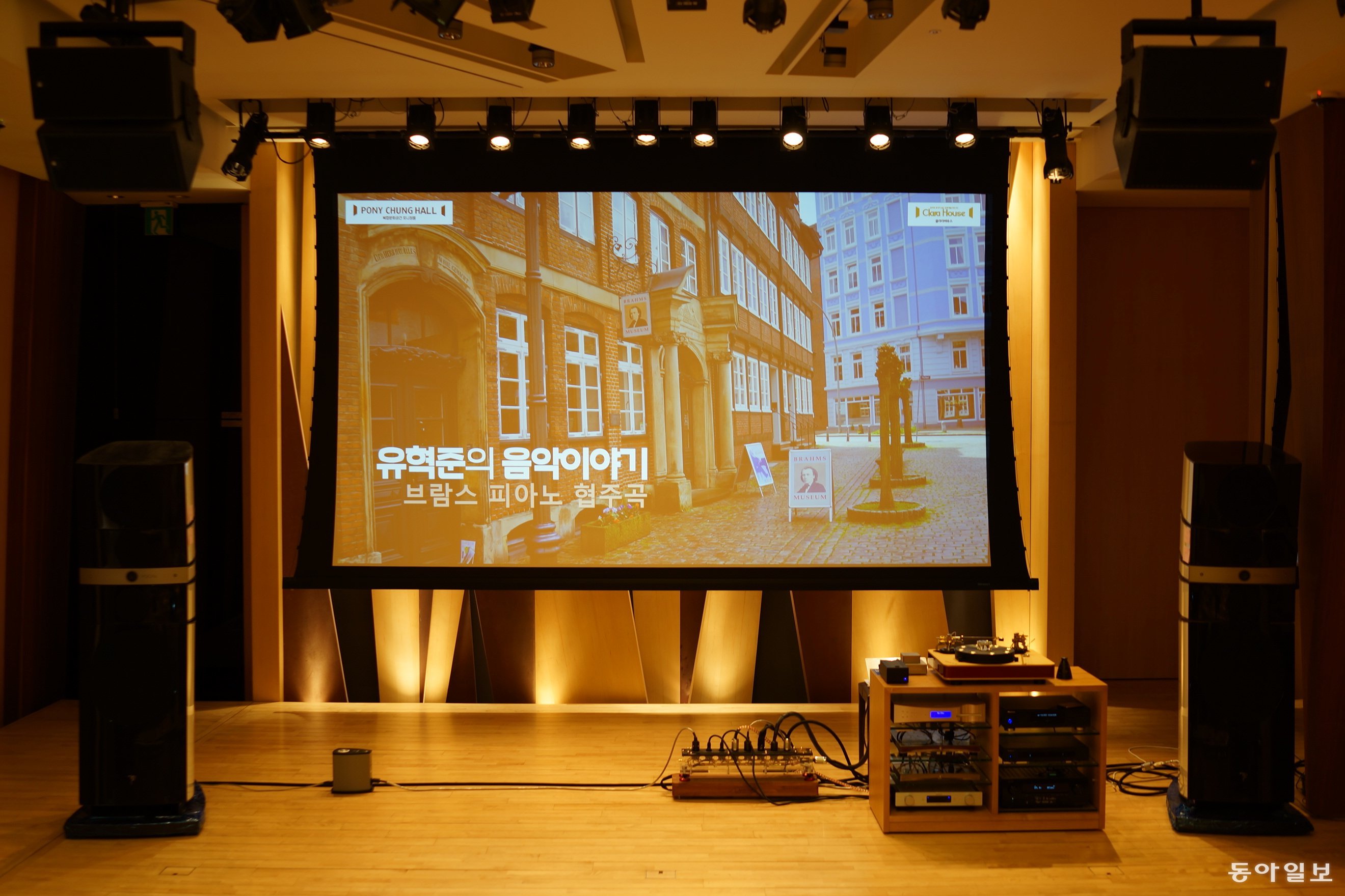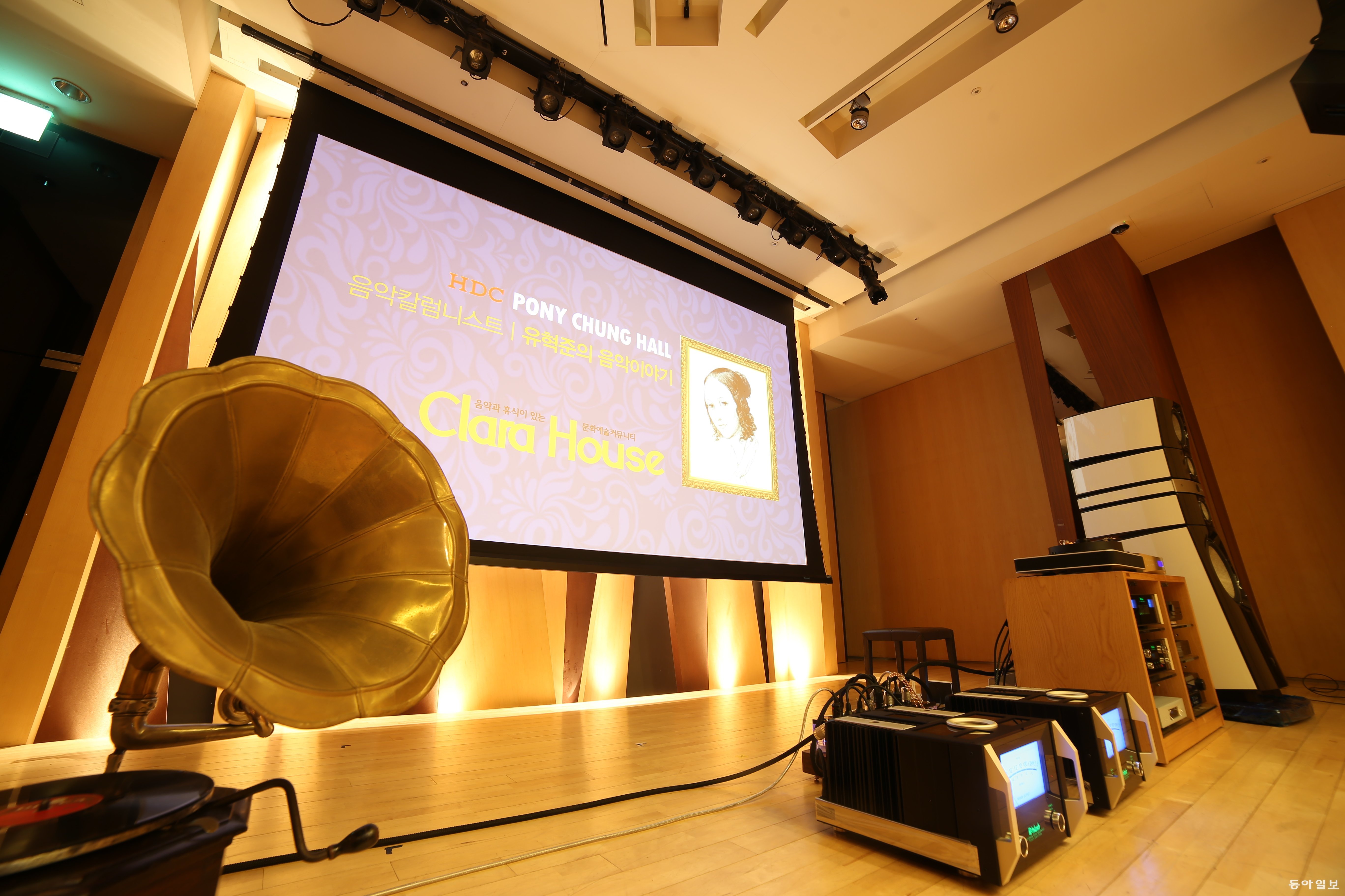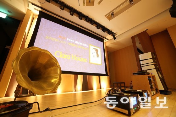 포니정홀 입구에 있는 육중한 나무로 된 문을 열고 들어가면 무대 위에 올려진 대형 스피커와 앰프, 영상시스템이 눈에 띈다. 아날로그 LP에서 4K 블루레이로 공연실황을 감상할 수 있는 5만 여장의 음반과 블루레이 등 다양한 소스를 갖추고 있다.