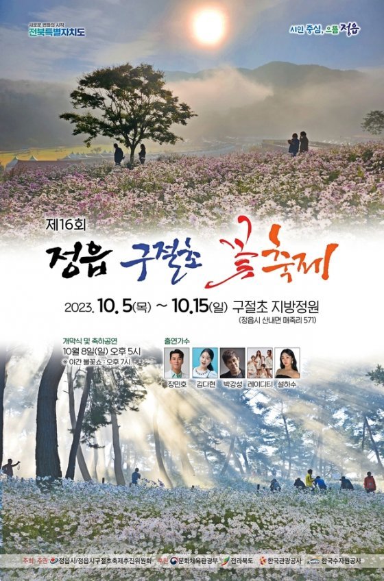 전북 제1호 지방정원인 ‘정읍 구절초 정원’에서 8일 오후 5시 열리는 개막식에는 기념식과 함께 축하공연으로 트로트 가수 장민호와 김다현, 7080 감성음악의 대표가수‘박강성’이 출연한다.