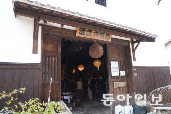 대나무로 장식한 공중전화박스.19세기에 개업한 사케 주조장에 있는 사카쿠라 교류관(酒蔵交流館)에서는 전통 주조장 견학과 시음, 술잔과 도자기, 수저 등 공예품 쇼핑도 즐길 수 있다.