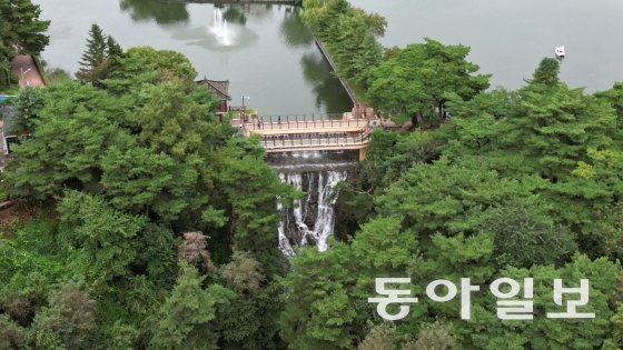 의림지 내 용추폭포. 약 30m 높이에서 쏟아지는 물 소리가 마치 용울음처럼 들린다고 해서 용폭포라고 불리는 이곳엔 투명 유리전망대가 설치돼 있어서 폭포 위를 걸어가는 듯한 체험을 즐길 수 있다.