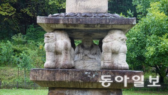 네 마리 사자가 호위하듯 서 있고 가운데 두건 쓴 부처상이 인상적인 사자빈신사지 사사자 구층석탑.석탑에는 고려 현종 13년(1022년)에 ‘부처의 힘을 빌려 적을 물리치려는 소망을 담아 9층의 탑을 세운다’는 글귀가 새겨져 있다. 그런데 이 석탑은 이곳 터의 거센 기운을 진압하기 위한 비보 풍수적 특징도 가지고 있다. 비보 풍수는 기운이 너무 거세거나 반대로 너무 빈약한 곳을 탑이나 돌 등으로 보완하는 장치를 가리킨다.