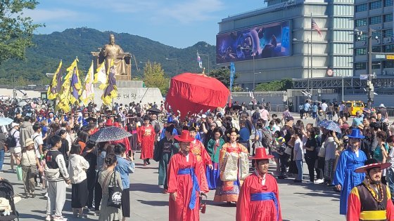 2일 서울 광화문광장에서 열린 어가행차 퍼포먼스. 세종대왕이 눈병 치료를 위해 초정으로 행차하는 것을 재현했다. 청주시 제공축제를 대표하는 프로그램은 21일 오후 열리는 세종대왕 어가행차다. 앞서 2일 서울 종로구 광화문광장에서 어가행차의 시작을 알리는 행사가 진행된 바 있다. 이 어가행차가 21일 초정약수 일대에 도착하는 모습이 연출되는 것이다. 어가행사에 참여하는 세종대왕과 소헌왕후 역은 일반인 공모로 선정했다.