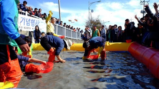 지난해 벌교 꼬막축제에서 참가자들이 ‘황금 꼬막을 찾아라’ 체험프로그램을 펼치고 있다(보성군 제공)2023.10.18/꼬막의 계절이 돌아왔다. 찬바람이 불면 제철을 맞는 벌교꼬막이 전국 미식가들의 발길을 전남 보성군 벌교로 유혹한다.