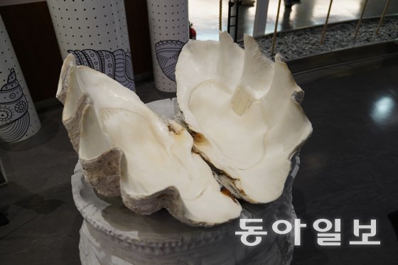 세계조개박물관에 전시돼 있는 대왕조개.신안의 갯벌은 우리나라 전체 갯벌 면적 중 15%를 차지할 정도로 중요한 지역이다. 그중 증도갯벌은 세계 람사르협약 등록습지이고, 비금-도초도 갯벌은 해양수산부가 습지보호구역으로 지정했다. 갯벌의 유기물을 먹으며 생존하는 조개와 고둥은 갯벌을 정화하는 가장 중요한 생물이다. 껍데기가 두 장인 조개류는 각종 장신구와 나전칠기로, 껍데기가 하나로 돼 있는 고둥은 악기로 활용돼 온 역사도 전시된다.