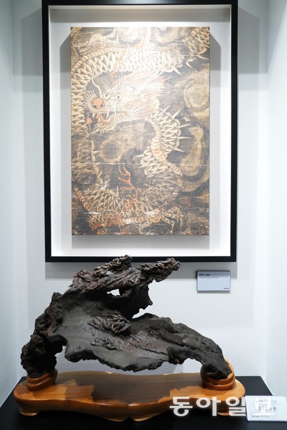 민화 ‘운룡도’와 닮은 수석 ‘운룡도의 용’.“수석은 움직이지 않으며 감각이 없는 무생물이지만 상상의 나래 속에 수석은 다양한 몸짓과 연상으로 우리에게 큰 감흥을 안겨주는 살아 있는 생물이다.”(원수칠 수석미술관장)