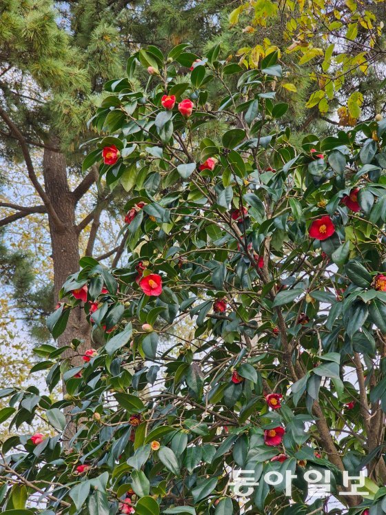 충청수영성으로 들어가는 계단을 오르면 돌로 쌓은 성에 아치형 문이 관람객을 맞이한다. 성문 주변에는 11월인데도 놀랍게 동백꽃이 피어 있다. 동백꽃은 내륙 지방에서는 2월이 돼야 피어나지만, 제주를 비롯해 남해안 서해안 등 바닷가에서는 좀 더 일찍 핀다고 한다. 심지어 벌써 시들어 통째로 떨어진 동백꽃도 있다.