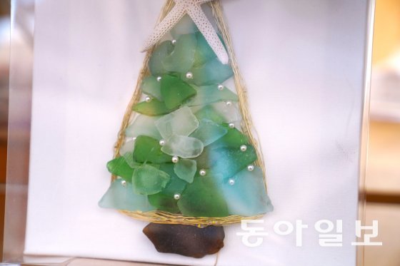 영목항 전망대는 내년 1월 말까지 개관 기념으로 무료입장이다. 로비 한구석에 바다유리(Sea Glass)를 활용한 공예품 숍이 눈길을 끈다. 바다유리는 연초록빛부터 에메랄드빛, 짙은 초록색, 하늘빛이 나는 유리 조각들을 이어 붙여 만든 공예품이다.
