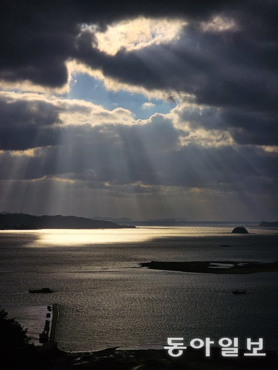 안면도 영목항에는 올해 6월 전망대가 세워졌다. 아름다운 곡선으로 높이 솟아 있는 전망대 모습에 이끌려 주차장에 차를 세우고 보니 노을 진 바닷가에 물이 빠진 갯벌이 넓게 드러나 있었다. 하늘에 짙게 깔린 구름 사이로 햇빛이 빔을 쏘듯 쏟아져 내렸다. 마치 하늘에서 성령이 강림할 것 같은 장엄한 모습이었다.