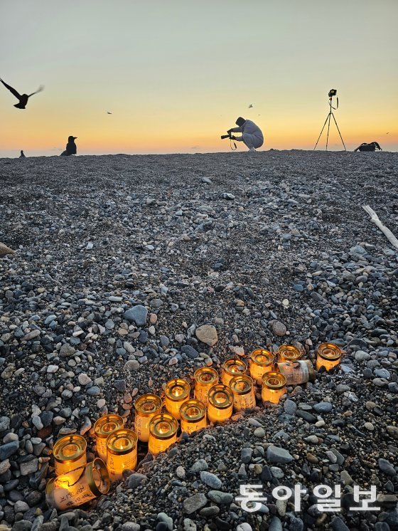 26일 오전 7시 반. 감포 해변에 도착하니 해변 모래사장에 밝은 빛이 나는 병들이 놓여 있었다. 가까이 가보니 병 속에 촛불이 들어 있었다. 촛불이 아직도 타고 있는 것으로 보아 누군가 밤새 기도했던 흔적인가 보다. 해변엔 가족들과 함께 다사다난했던 한 해를 정리하고, 새로운 출발을 기원하기 위해 찾아온 관광객들로 가득차 있었다.