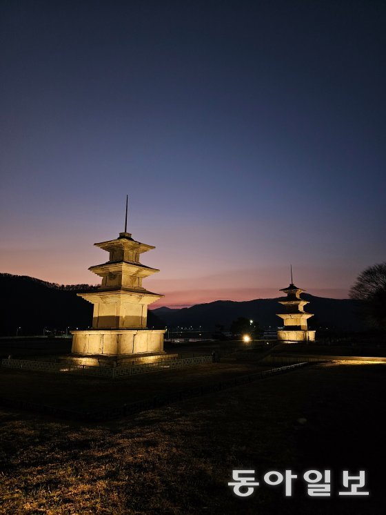 해질 녘 무렵의 경주 감은사지 3층 석탑.