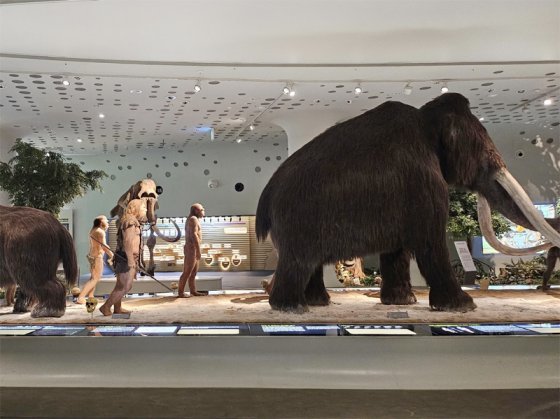 연천군 전곡선사박물관에서는 약 700만 년 전 인류 모습과 생활상 등 인류 발전사를 시대별로 전시하고 있다. 경기관광공사 제공유적지에 있는 전곡선사박물관도 아이들이 관심을 가질 만한 곳이다. 외관은 마치 UFO(미확인비행물체)를 연상시킨다. 전시 주제는 ‘시간여행’이다. 전시실에서는 거대한 어금니만으로도 관람객을 압도하는 매머드 화석과 인간이 만들어낸 다양한 형태의 사냥 도구를 볼 수 있다. 유인원부터 현대인까지 700만 년의 인류 발전사를 시대별로 전시했는데 마치 당시 생활하던 사람을 그대로 옮겨놓은 것으로 착각할 정도다.