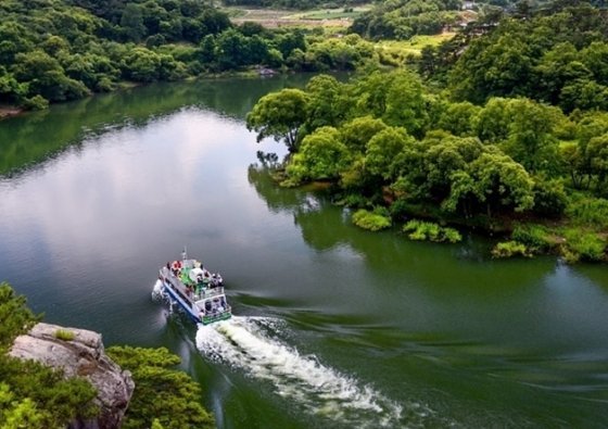 산막이옛길 괴산호 유람선.(자료사진)/뉴스1먼저 70억원을 들여 수상데크(861m)를 포함한 2.3㎞의 수변산책로와 괴산댐 공도교를 활용한 생태휴양길을 구축하는 ‘순환형 생태휴양길 조성사업’을 추진하고 있다. 2022년 12월 착공한 사업은 올해 상반기 마무리된다.