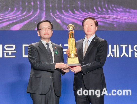박철희 호반건설 총괄사장과 최상목 부총리 겸 기획재정부장관이 고액 납세의 탑 시상식에서 기념사진을 촬영하고 있다. 호반건설은 건설사로는 유일하게 고액 납세의 탑(국세 1000억 원 탑)을 수상했다.김민범 동아닷컴 기자 mbkim@donga.com