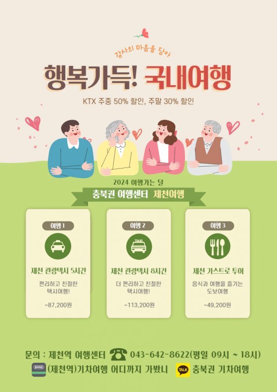 다음 달 1일(토)부터 7월7일(일)까지 운영하는 이 여행 상품은 오는 16일부터 레츠코레일과 코레일톡에서 예약할 수 있다. 자세한 내용은 제천역 여행센터나 네이버 밴드(제천역 기차여행 어디까지 가봤니), 카카오톡 채널(충북권 기차여행)에서 확인하면 된다.