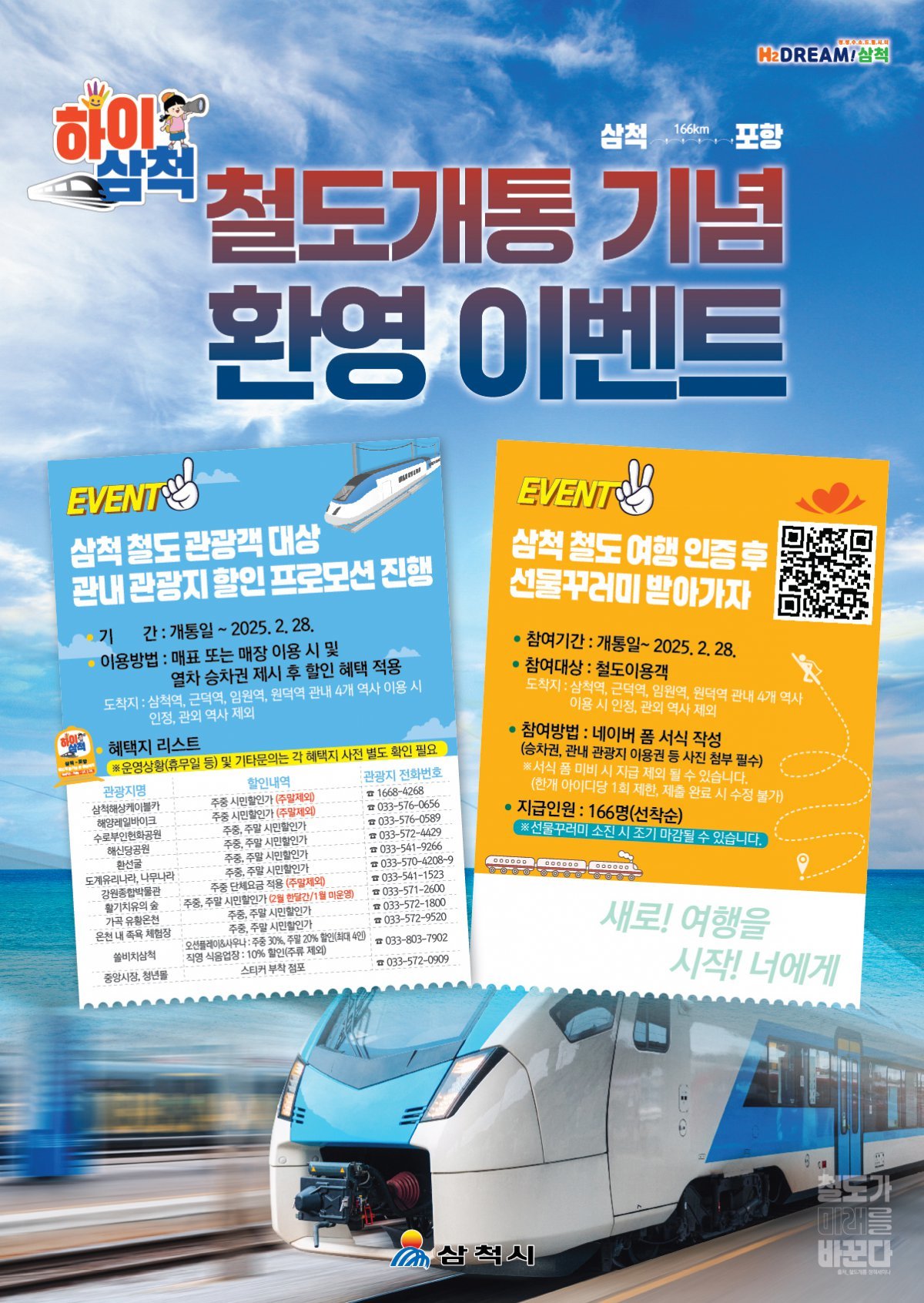 삼척~포항을 잇는 ‘166.3㎞’의 철도 개통을 기념해 ‘166명’에게 선착순으로 다양한 삼척 관광 홍보 기념품을 담은 선물 꾸러미를 지급할 예정이다.