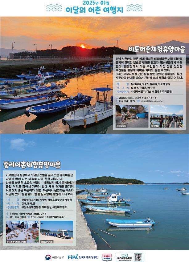 해양수산부가 2025년 1월의 어촌 여행지로는 경남 사천시의 비토마을과 충남 서산시 중리마을이 선정했다.