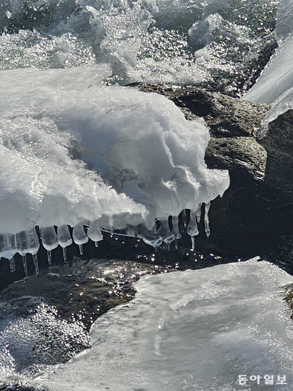 한탄강 급류의 물보라가 얼어 고드름이 맺혔다.
