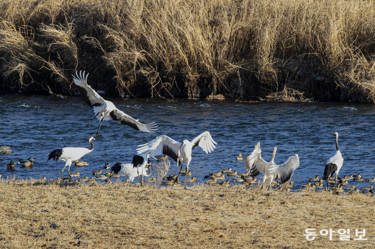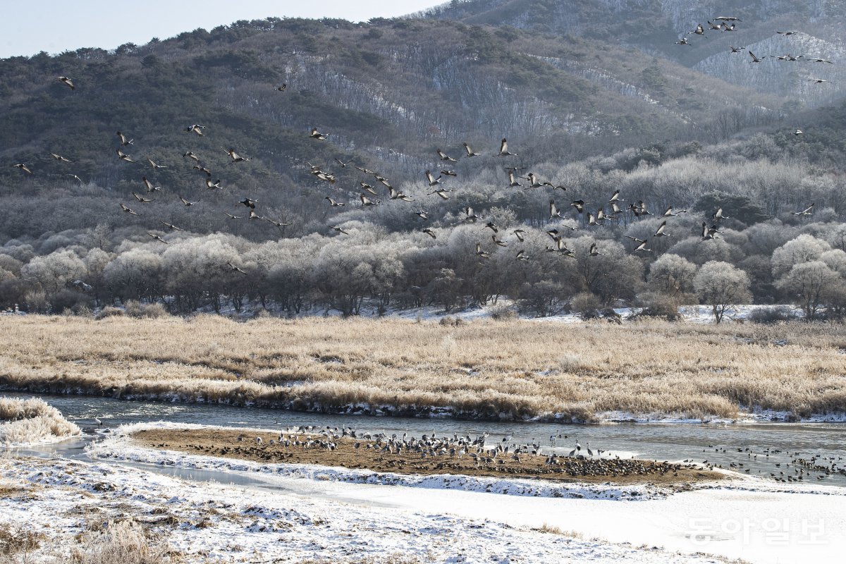 두루미떼가 겨울을 보내는 철원 이길리 한탄강 탐조대 앞 모래톱. 김영호 작가 제공