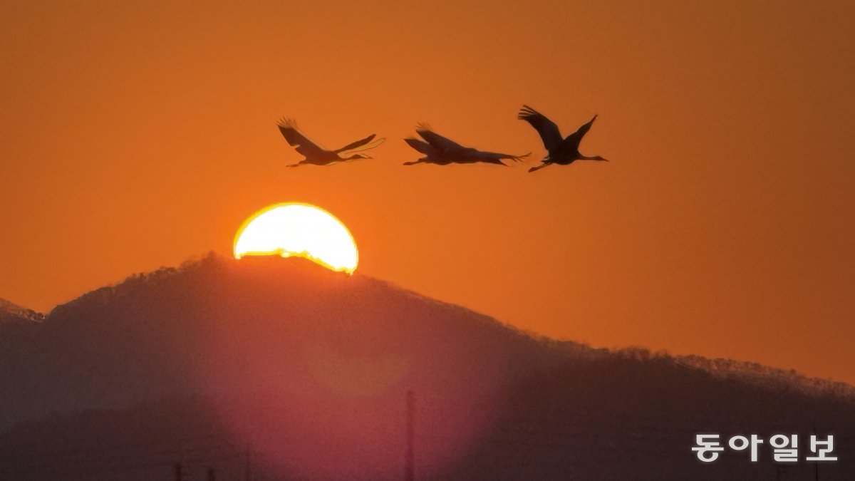 철원평야 너머로 지닌 태양을 배경으로 날고 있는 두루미.전승훈 기자 raphy@donga.com