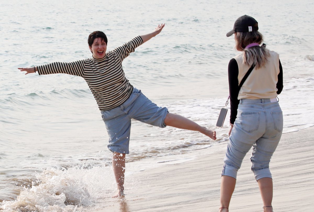 23일 오후 부산 해운대해수욕장을 찾은 외국인 관광객들이 바닷물에 발음 담그며 즐거운 시간을 보내고 있다. 2025.1.23/뉴스1 ⓒ News1 윤일지 기자