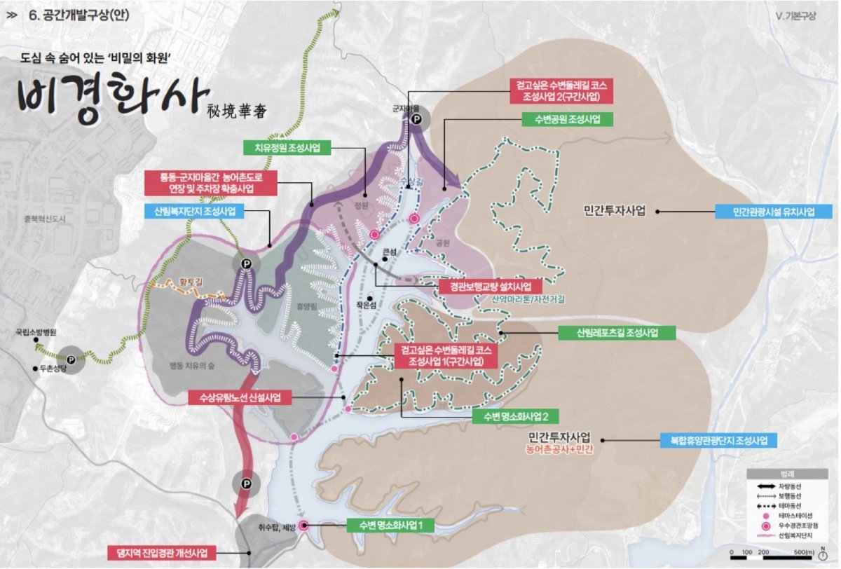 개발 콘셉트는 도심 속 숨어 있는 비밀의 화원이란 뜻의 ‘비경화사’다. 나뭇잎 잎맥처럼 여러 개로 뻗어져 있는 맹동저수지만의 지형 특색을 살려 신비로운 둘레길을 조성한다.
