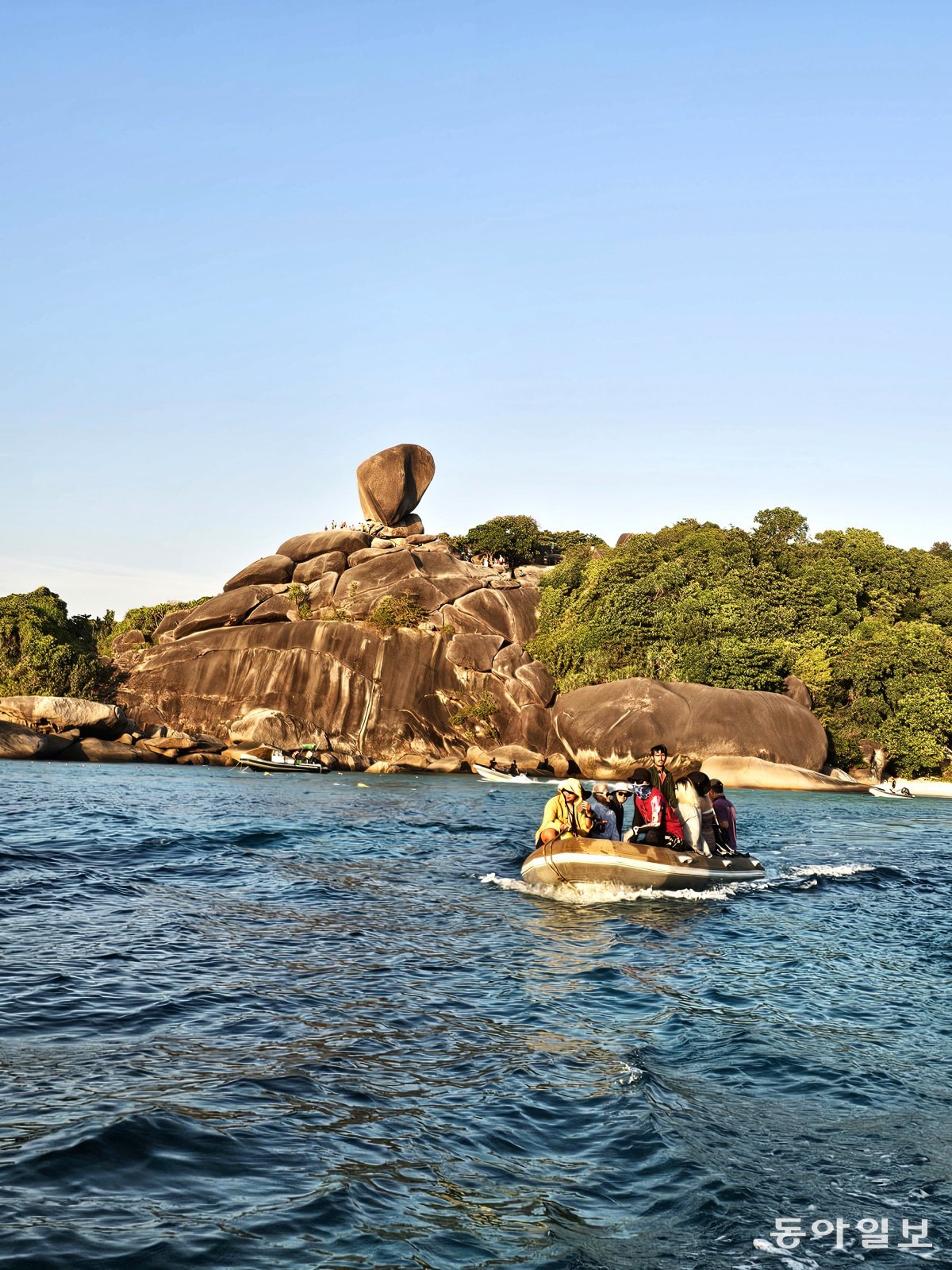 시밀란 국립공원 코끼리 머리 바위(엘리펀트 헤드락) 포인트로 보트를 타고 가는 다이빙 관광객들.