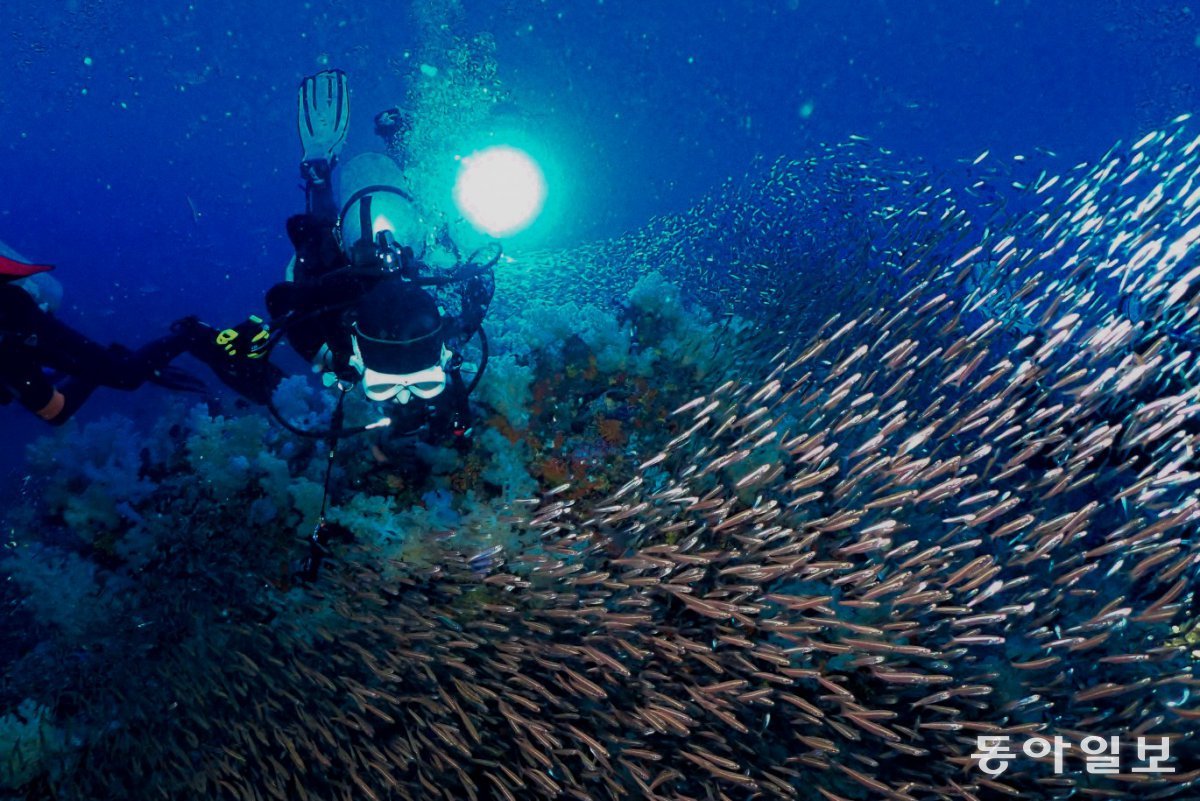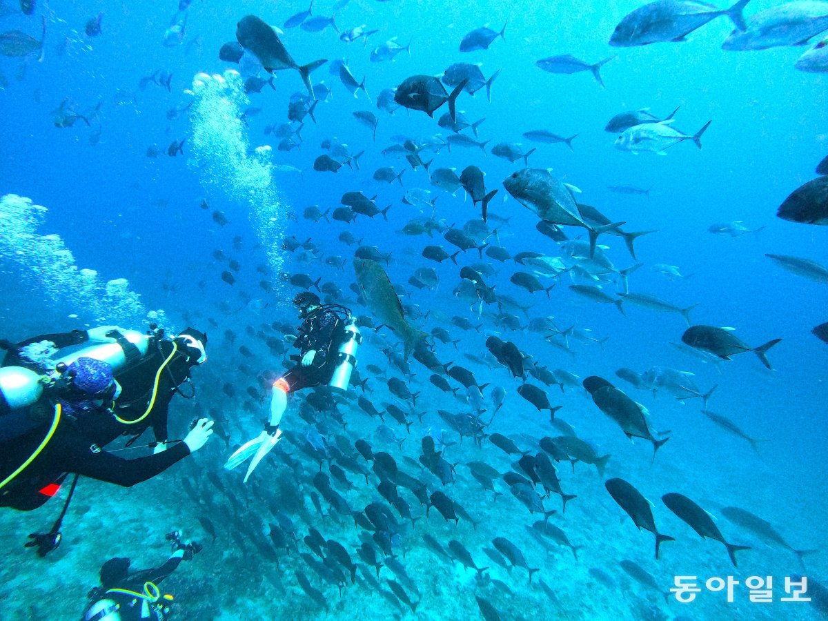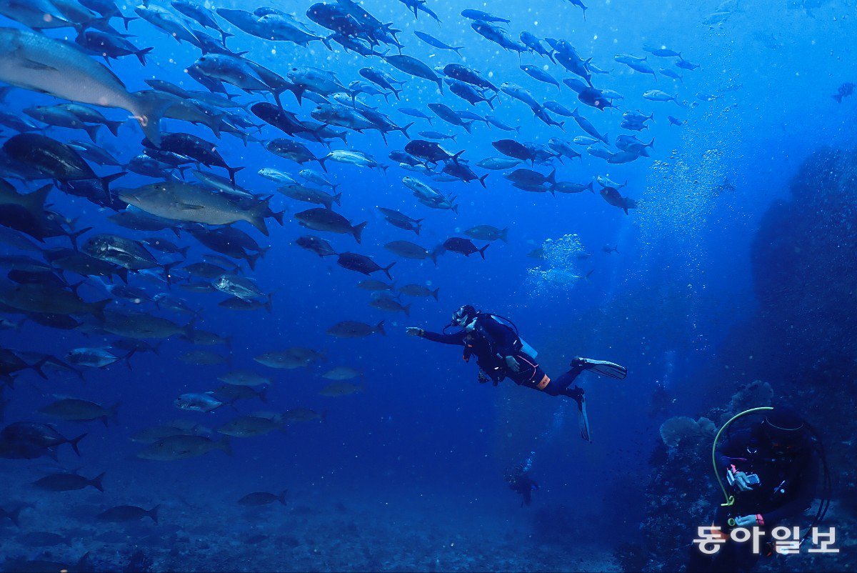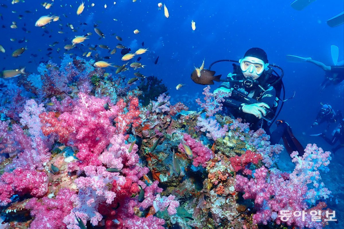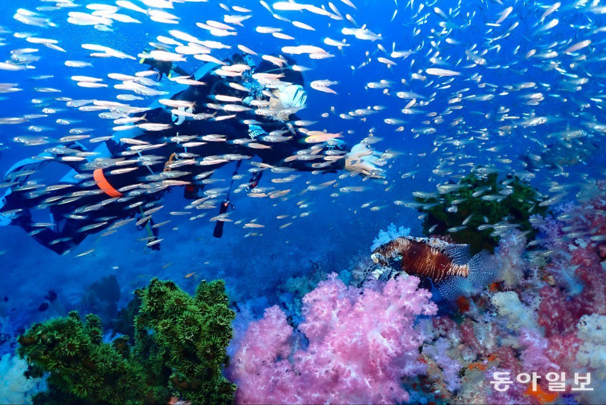 동틀녘인 오전 7시. 배에서 뛰어내린 후 부력조절용 조끼(BCD)에 공기를 빼고 천천히 입수했다. 수심 20m까지 바닥에 내려간 후 산호초 지대를 지나고 계곡안으로 들어섰다. 물 속에 고기가 많을 때 ‘물반 고기반’이라고 하는데, 이 곳은 ‘물 3, 고기 7’이라고 해도 좋을 듯하다. 사람 얼굴만큼 큰 물고기들이 몰려다니는 데 가까이 다가가도 도망갈 생각을 하지 않는다.