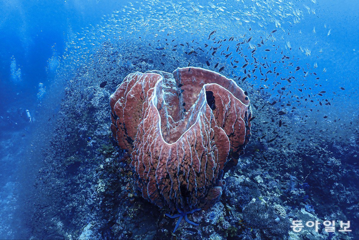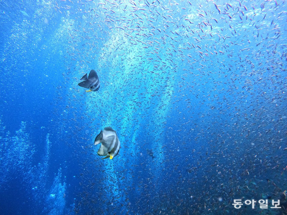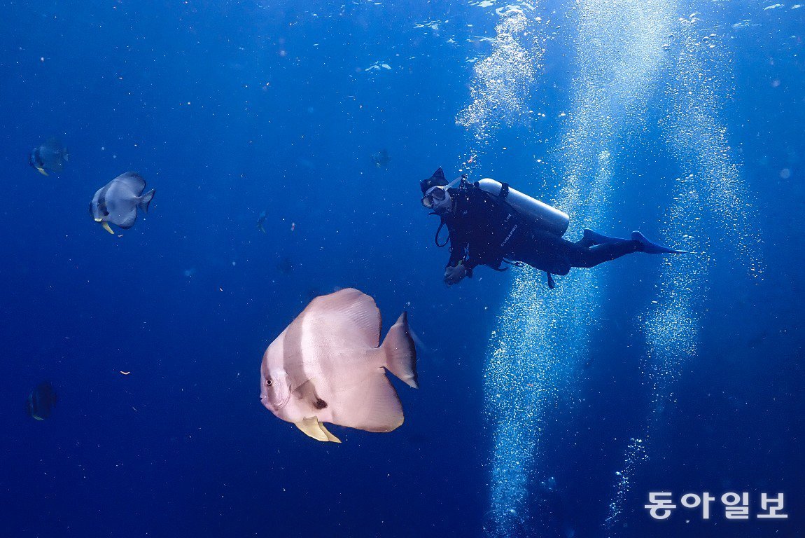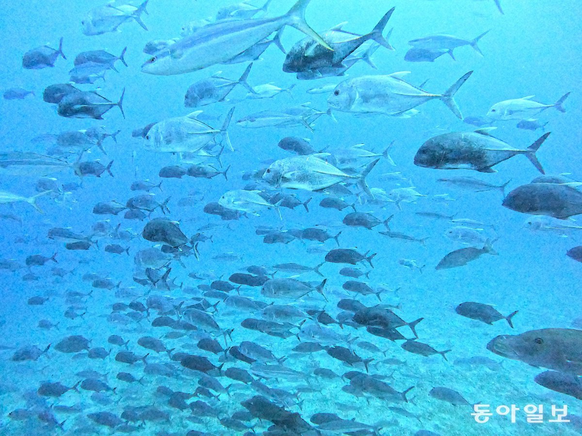 동틀녘인 오전 7시. 배에서 뛰어내린 후 부력조절용 조끼(BCD)에 공기를 빼고 천천히 입수했다. 수심 20m까지 바닥에 내려간 후 산호초 지대를 지나고 계곡안으로 들어섰다. 물 속에 고기가 많을 때 ‘물반 고기반’이라고 하는데, 이 곳은 ‘물 3, 고기 7’이라고 해도 좋을 듯하다. 사람 얼굴만큼 큰 물고기들이 몰려다니는 데 가까이 다가가도 도망갈 생각을 하지 않는다.