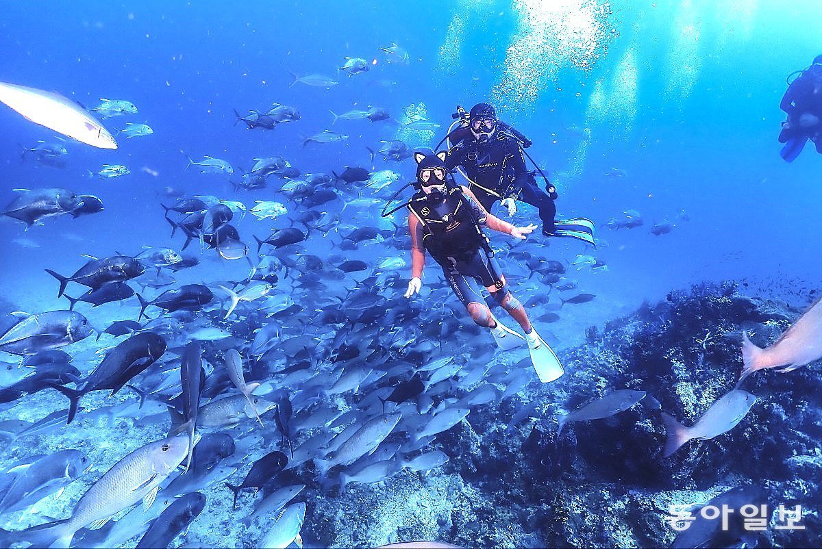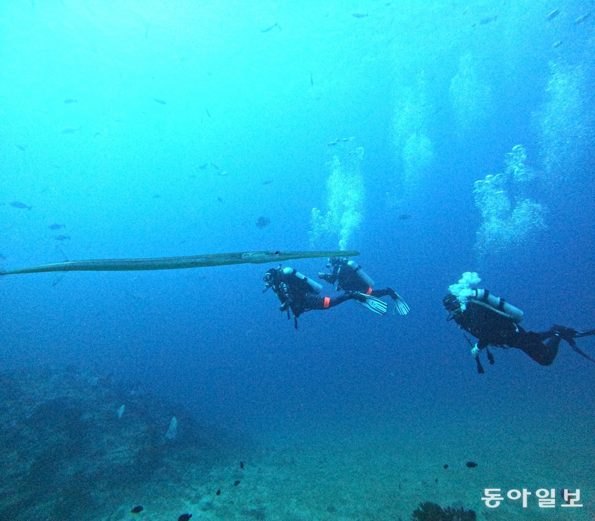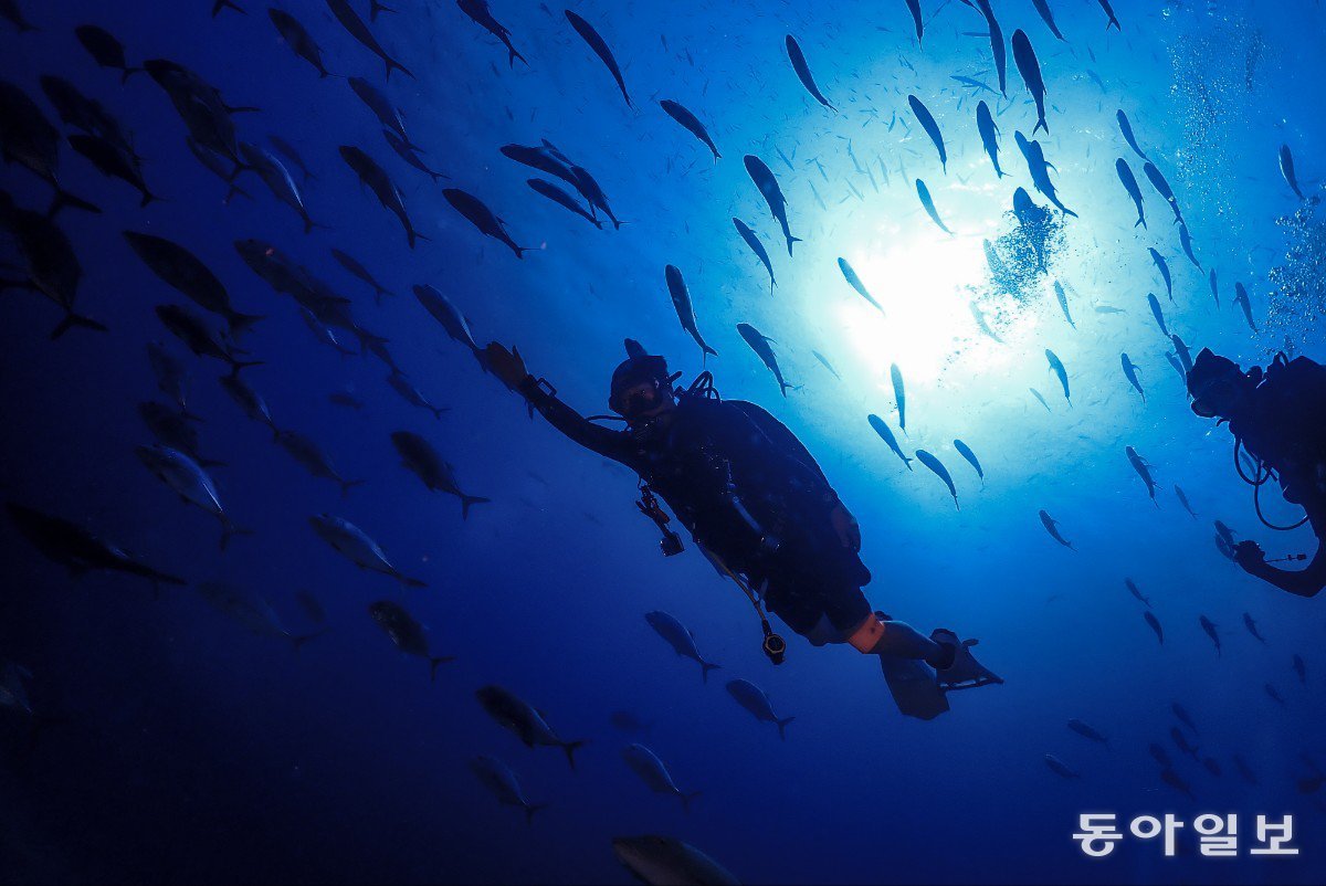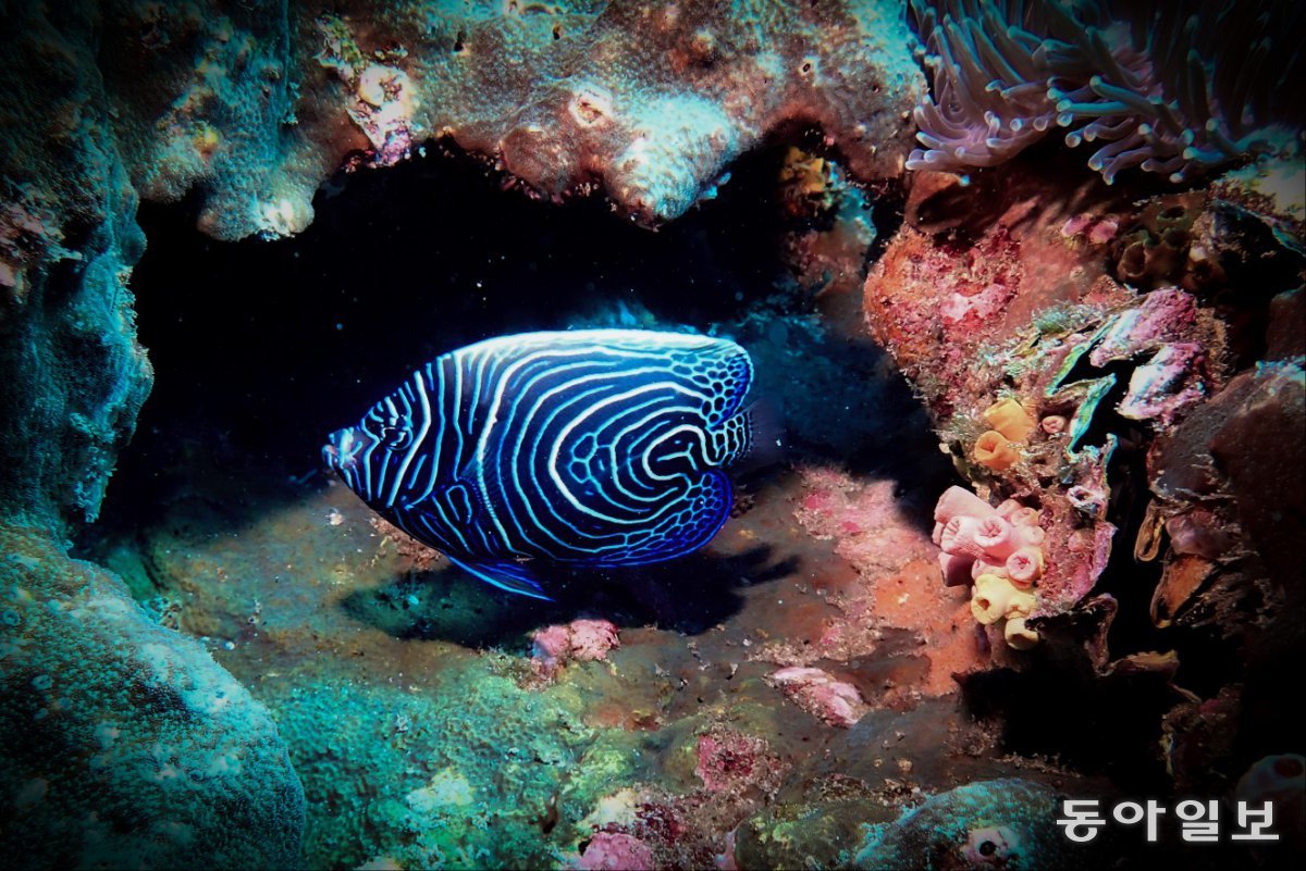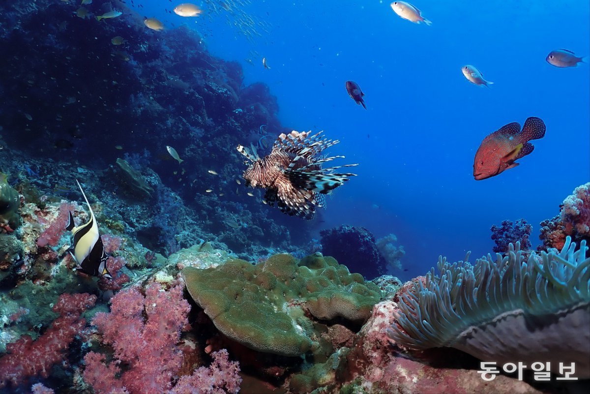 동틀녘인 오전 7시. 배에서 뛰어내린 후 부력조절용 조끼(BCD)에 공기를 빼고 천천히 입수했다. 수심 20m까지 바닥에 내려간 후 산호초 지대를 지나고 계곡안으로 들어섰다. 물 속에 고기가 많을 때 ‘물반 고기반’이라고 하는데, 이 곳은 ‘물 3, 고기 7’이라고 해도 좋을 듯하다. 사람 얼굴만큼 큰 물고기들이 몰려다니는 데 가까이 다가가도 도망갈 생각을 하지 않는다.