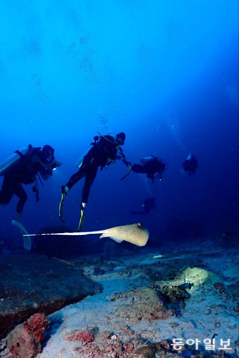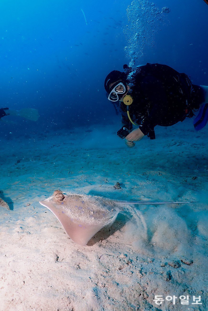 시밀란국립공원 해저 모래바닥에서 만난 가오리(블루 스팟 리본테일 레이)를 촬영하고 있는 본보 전승훈 기자. Tommy 제공