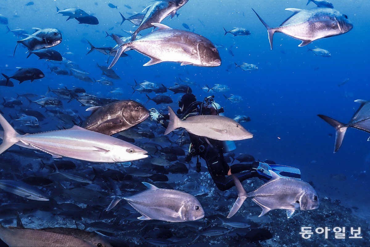 저멀리 트레발리 떼가 스쿨링(Schooling)을 하고 있다. 빙글빙글 돌고 있는 모습이 토네이도 기둥같다. 살금살금 다가가 자이언트 트레발리 떼 안으로 들어간다. 나를 가운데 두고 빙글빙글 도는 거대한 물고기들을 바로 눈 앞에서 보고 있노라니 아찔하다.