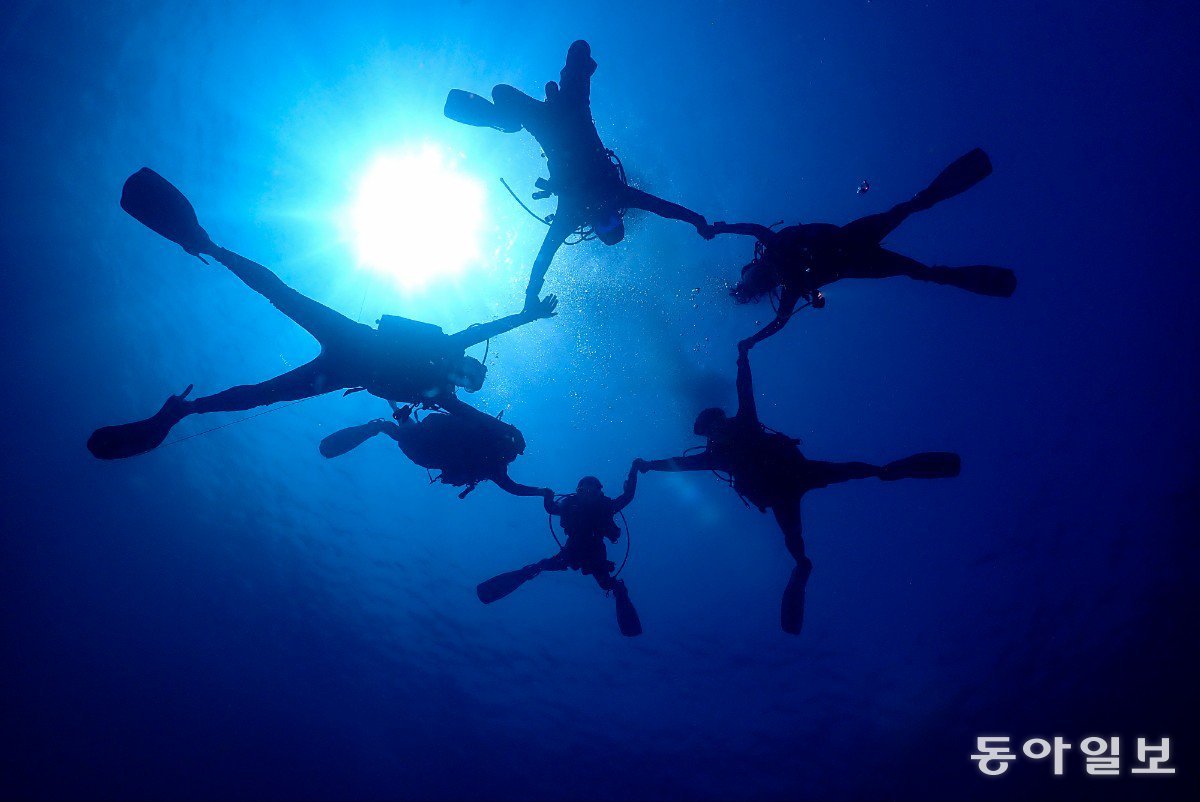 다이빙 도중 별모양을 만들어내고 있는 다이버들.