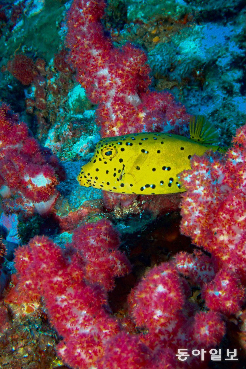 시밀란 산호초 속에 숨어 있는 박스 피쉬. 네모난 상자를 닮은 노란색 물고기다.