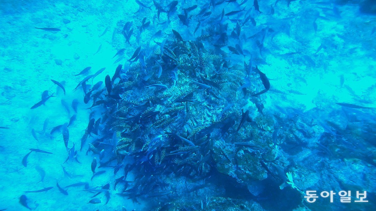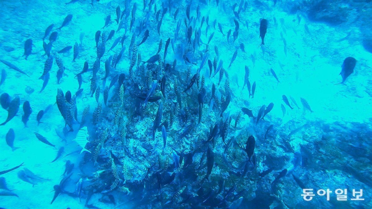오히려 “야! 비켜”하며 내 몸을 툭툭 건드리며 무심한 표정으로 지나간다. 대형 물고기들이 펑펑 터뜨리고 다니는 흰색 액체로 바닷물은 뿌옇다. 번식을 위해 수컷이 정액을 내뿜는 장면이다. 물 속에 떠다니는 허연 것들은 곧 수정이 돼 치어떼가 된다.