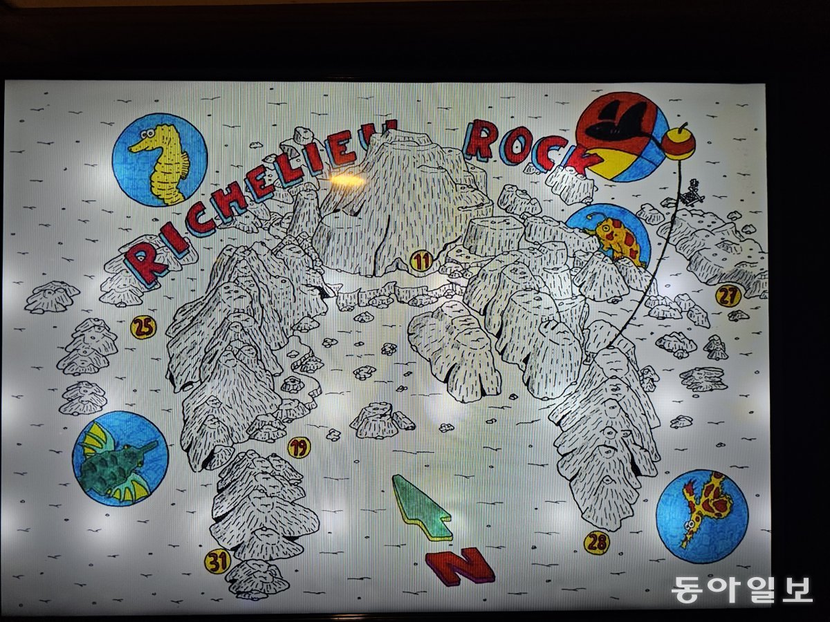리슐리외 락은 썰물때마 수면 위로 살짝 드러나는 암초다. 물 속에 크고 작은 바위 절벽들이 말발굽처럼 유(U)자 형으로 둘러싸고 있다. 둥그런 형태의 바위 계곡은 프로야구장 규모의 크기로 산호초와 물고기들의 천국이다.