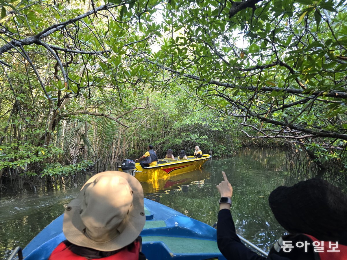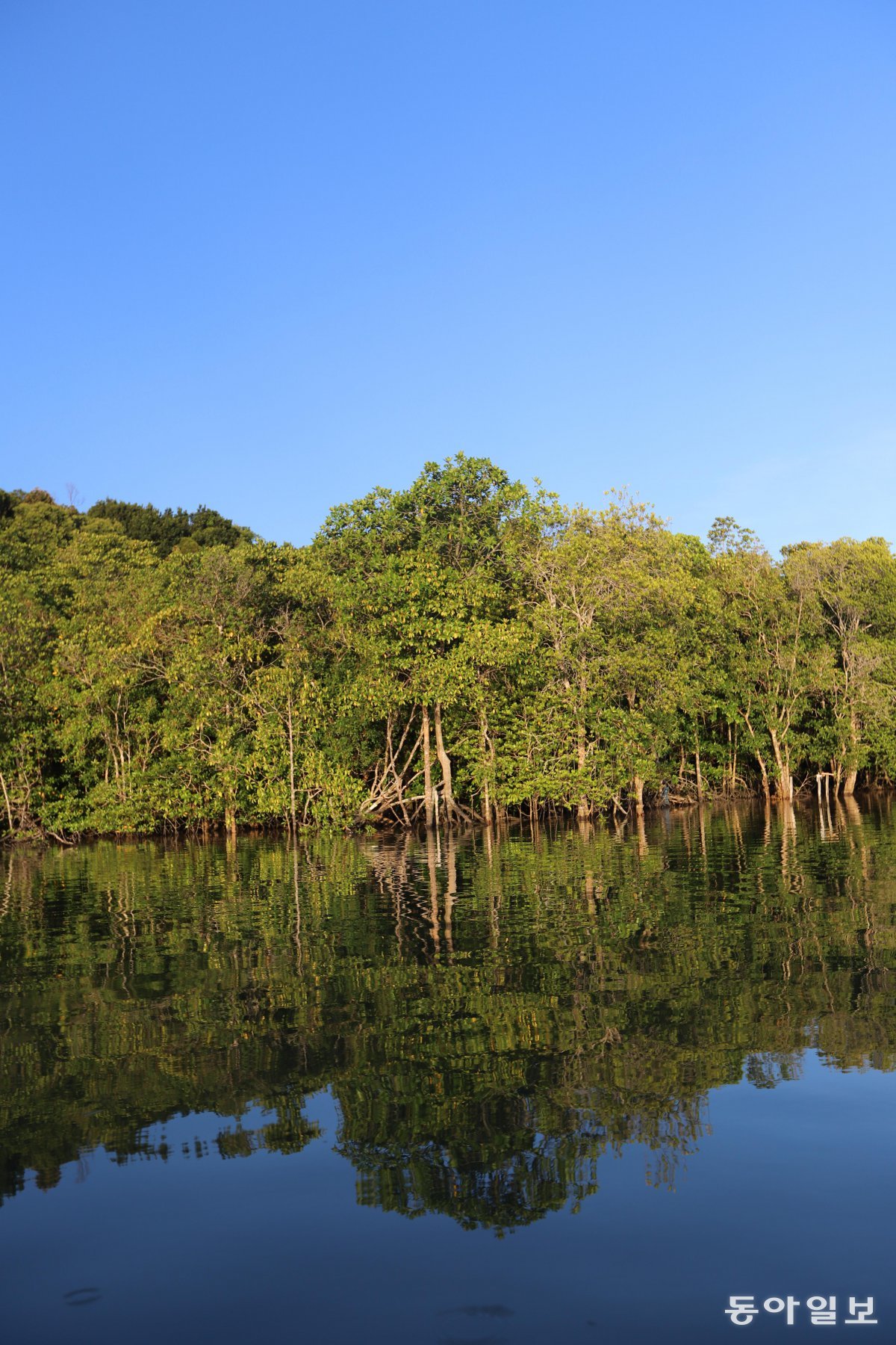 인도네시아는 해안가에 맹그로브 숲이 잘 발달돼 있다. 빈탄 리조트 내에도 보트를 타고 맹그로브 숲 속 깊숙한 곳까지 돌아보는 투어가 있다. 구명조끼를 입고 승선한 보트는 시원하게 바람을 가르며 강 위로 달려간다. 양쪽으로는 키가 30m가 훌쩍 넘는 맹그로브 숲이 우거져 있다. 보트는 큰 강변을 달리다가 좁은 숲 속 수로로 들어간다. 5~6m에 불과한 수로 위로 맹그로브 나뭇가지들이 낮게 드리워져 통과할 때마다 고개를 숙여야 한다.
