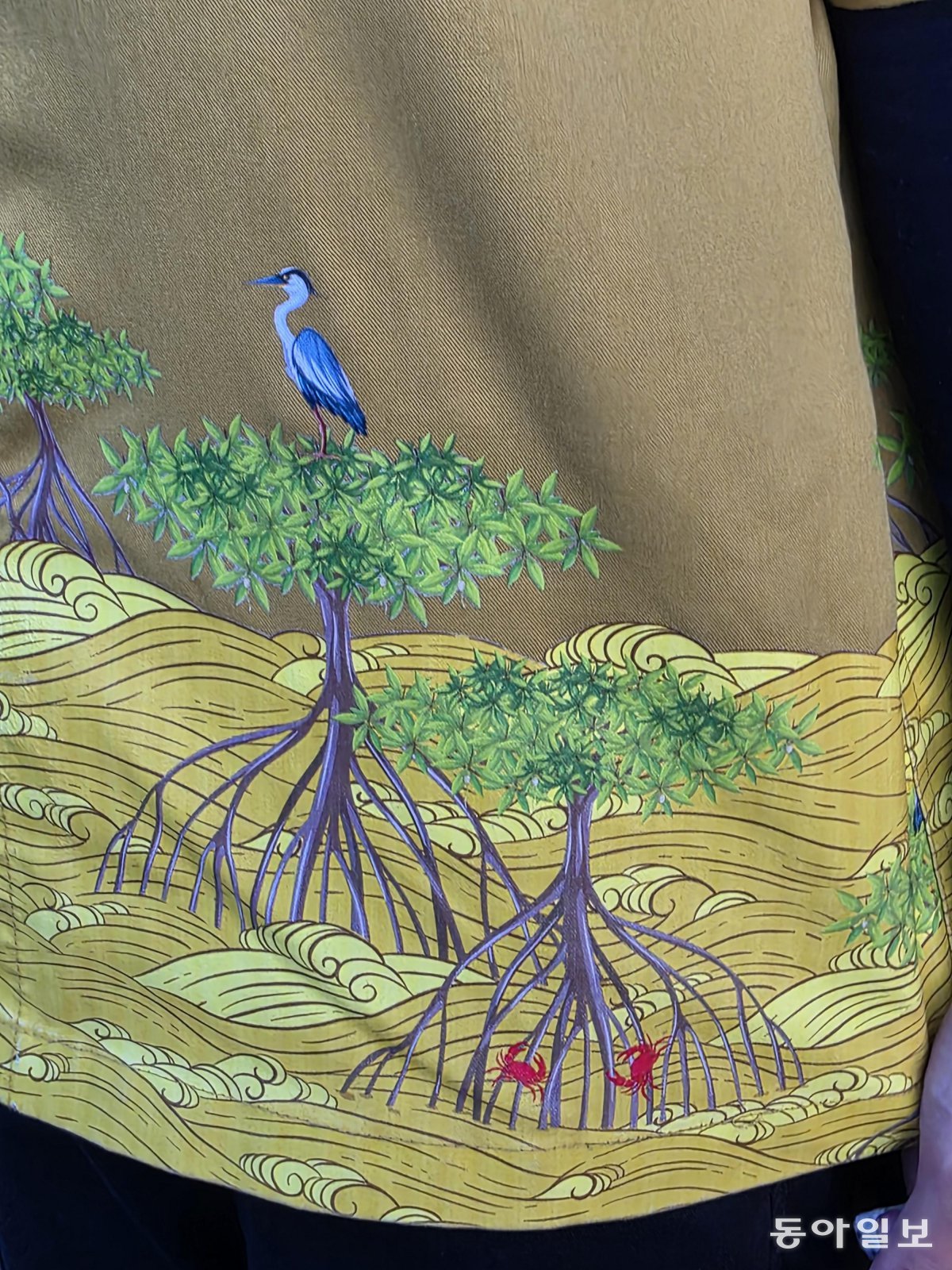 맹그로브숲 투어 가이드 옷에 그려져 있는 맹그로브 나무. 뿌리 사이에 수많은 해양생물이 살아간다. 투어를 마친 후 맹그로브 숲 가이드와 인사를 하던 중 그녀의 노란색 티셔츠에 그려진 그림에 눈길이 갔다. 맹그로브 나무의 초록색 나뭇잎 아래 뿌리가 높게 솟아 올라 있었다. 물결이 찰랑찰랑하는 뿌리 사이에는 붉은색 게 두마리가 놀고 있는 아름다운 그림이었다.
