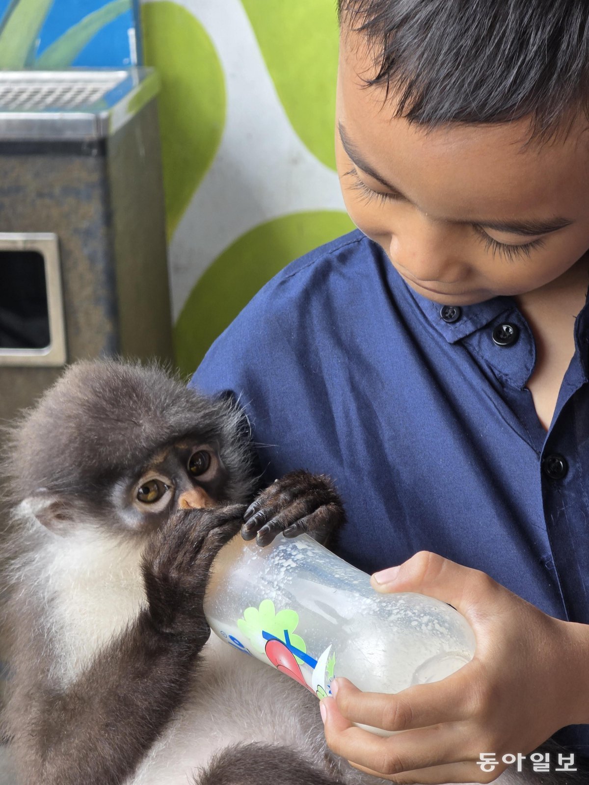 아기원숭이를 품에 안고 우유를 주는 관광객.